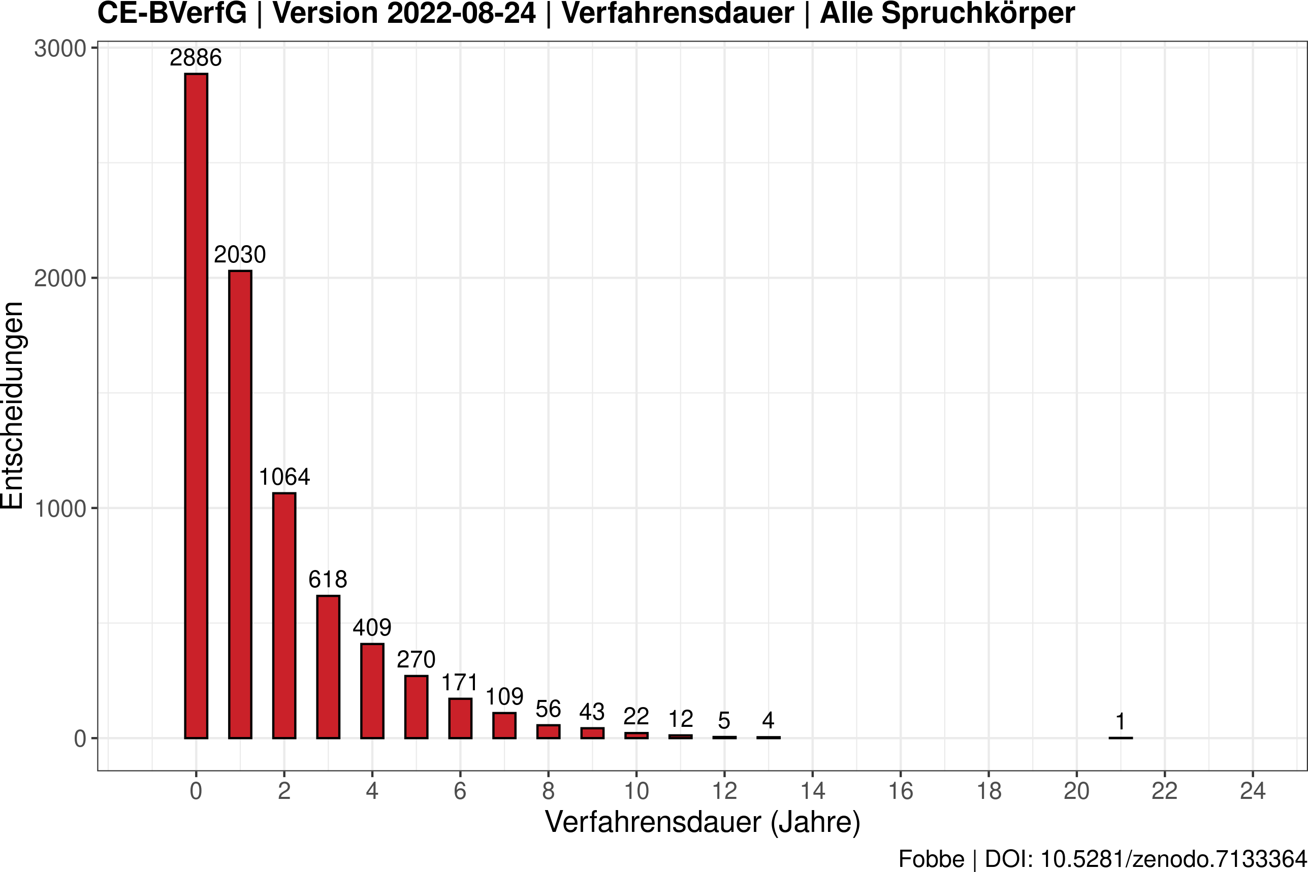 In December I published an analysis of the length of proceedings before the German Federal Constitutional Court (BVerfG) in RECHTS|EMPIRIE, a German science blog. The links in the info box above will direct you to the original text of the article and the source code (in R). Below is an English summary.